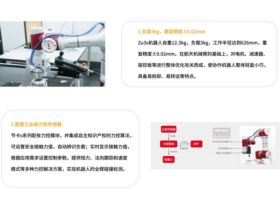 BFT机器人一站式机器人工业互联网平台提供的节卡ZU3s协作机器人配置工业级力觉传感器(在机器人末端或底座集成力控传感器); 自重12.3kg,负载3kg,重复定位精度±0.02mm,工作半径达到626mm,支持拖拽编程。