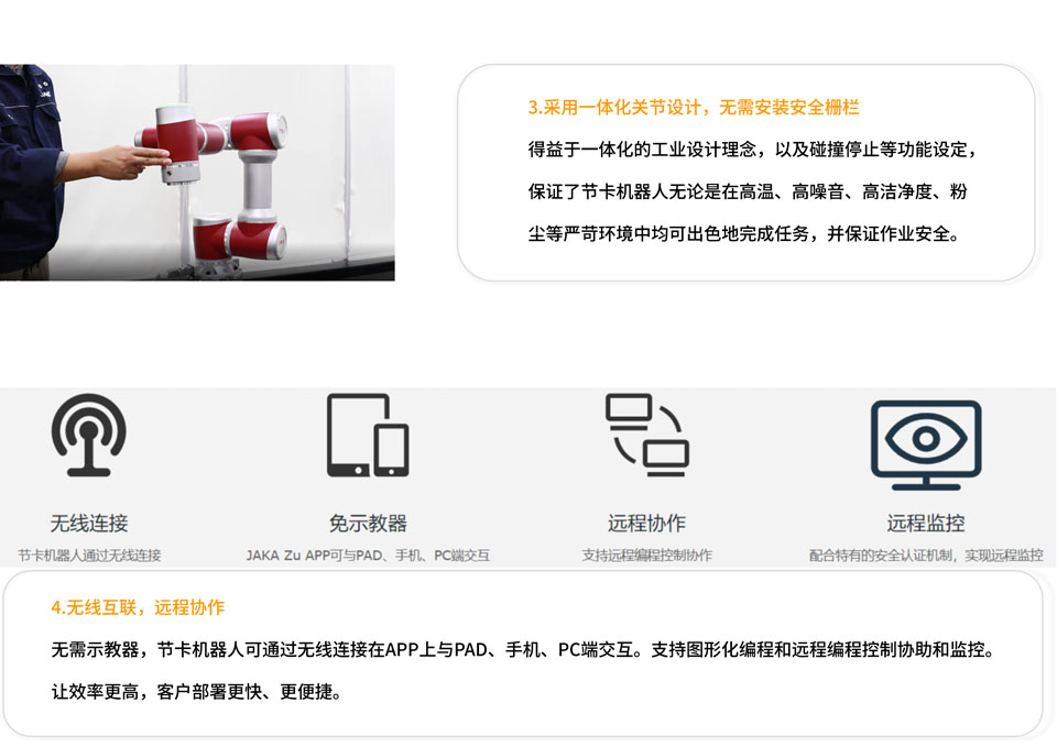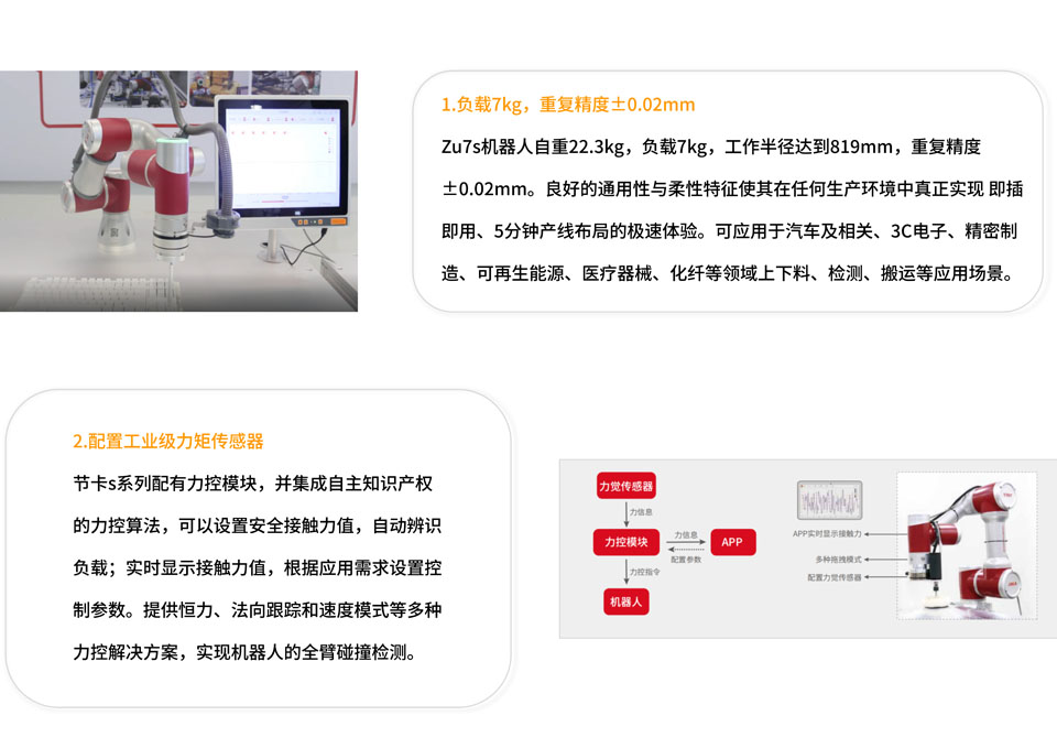 BFT机器人一站式机器人工业互联网平台提供的节卡ZU7s协作机器人配置工业级力觉传感器(在机器人末端或底座集成力控传感器); 自重22.3kg,负载7kg,工作半径达到819mm,重复定位精度±0.02mm,支持拖拽编程。