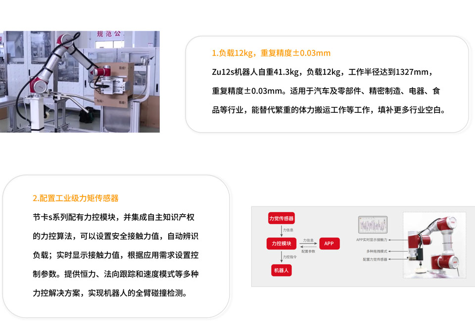BFT机器人一站式机器人工业互联网平台提供的节卡ZU12s协作机器人自重41.3kg,负载12kg,工作半径达到1327mm,重复定位精度±0.03mm,支持拖拽编程。更高载荷,更大工作半径,替代繁重的体力搬运工作,兼顾部署灵活性和使用便捷性。
