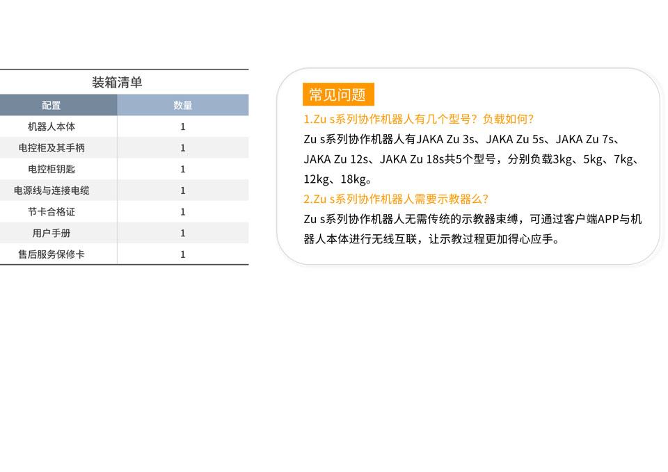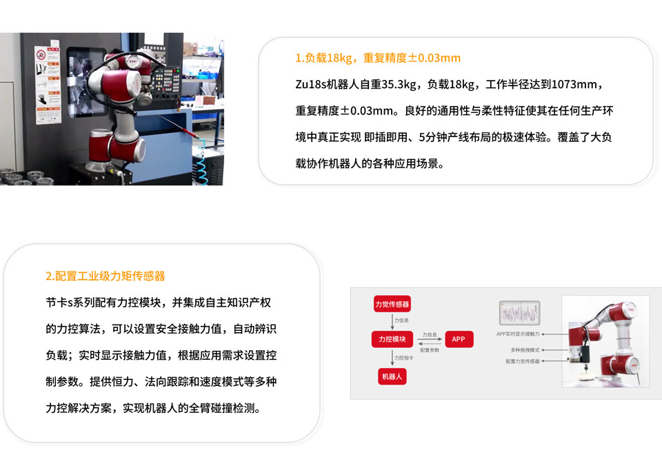 BFT机器人一站式机器人工业互联网平台提供的节卡ZU18s协作机器人自重35.3kg,负载18kg,工作半径达到1073mm;重复定位精度±0.03mm,支持拖拽编程,无需安装安全栅栏,与人、机器人、周围环境共融协作。 提供更好的人机交互体验和安全保障; 提供恒力、法向跟踪和速度模式等多种力控解决方案。