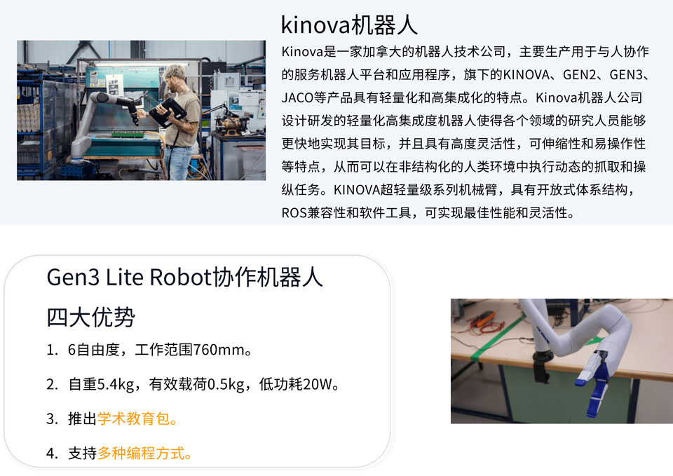 Kinova Gen3 Lite Robot协作机器人的有效载荷为0.5kg,最大覆盖面为760毫米,Gen3 lite适用于所有级别的专业知识,因此客户可以控制机器人执行从简单抓取任务到在MATLAB、ROS、C++和Python中编写更复杂的操作应用程序。