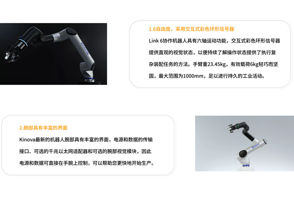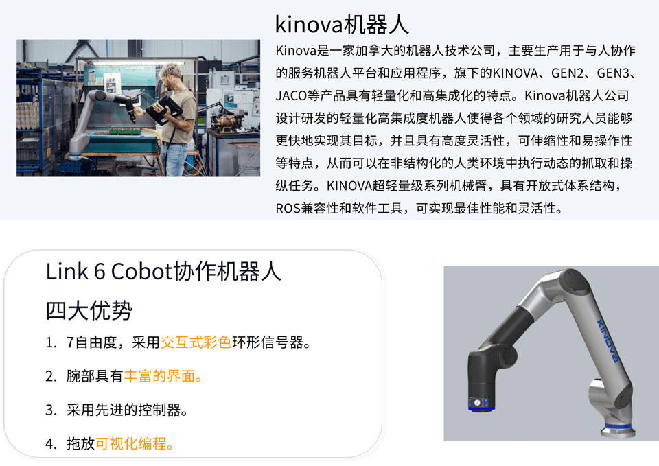 Kinova Link 6 Cobot协作机器人的有效载荷为6kg,最大覆盖面为1000毫米,集成的力-扭矩传感器为客户提供了执行复杂装配任务的方法,Link 6 Cobot可以通过示教器进行简易编程,节省编程时间。