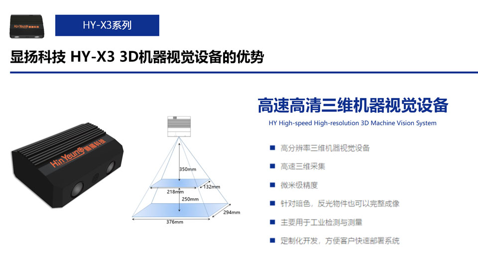 显扬科技HY-X3三维机器视觉是一台高分辨率三维机器视觉设备,能够进行高速三维采集,视野范围为218x132mm ~ 376x294mm,扫描速度为15Hz,工作距离为200mm ~ 600mm,适用景深400mm。