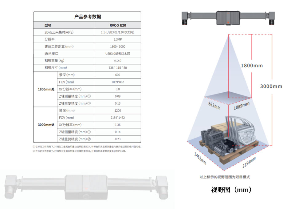 如本科技RVC-X E20的分辨率为2.3MP,相机重量约2.0kg,3D点云采集时间为每秒1.1(USB3.0)/1.9(以太网),一机多用,适用不同场景。