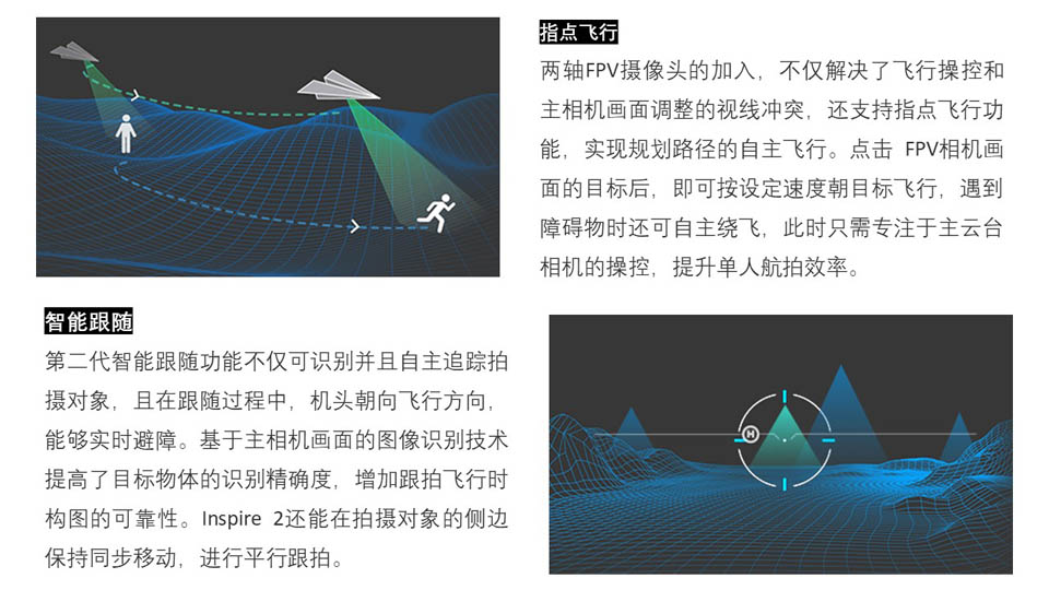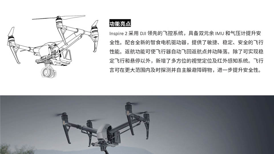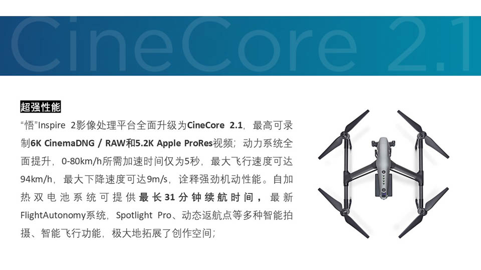 “悟”Inspire 2影像处理平台CineCore 2.0全面升级为CineCore 2.1,搭配DJI 大疆全新推出的禅思X7相机,最高可录制6K CinemaDNG / RAW和5.2K Apple ProRes视频; 动力系统全面提升,0-80 km/h所需加速时间仅为5秒,最大飞行速度可达94 km/h,最大下降速度可达9 m/s,诠释强劲机动性能。