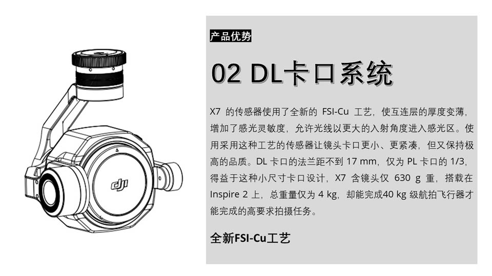 禅思 X7 是为电影拍摄推出的一款自带云台的紧凑型 S35 相机,目前可搭配在 Inspire 2 上使用。 X7 配备 2400 万像素 CMOS 传感器,最高可支持 6K 30fps、3.9K 59.94fps CinemaDNG 无损视频, 与 5.2K 30fps、2.7K 59.94fps Apple ProRes 视频*,以及高达 2400 万像素每秒 20 帧的 RAW 连拍。
