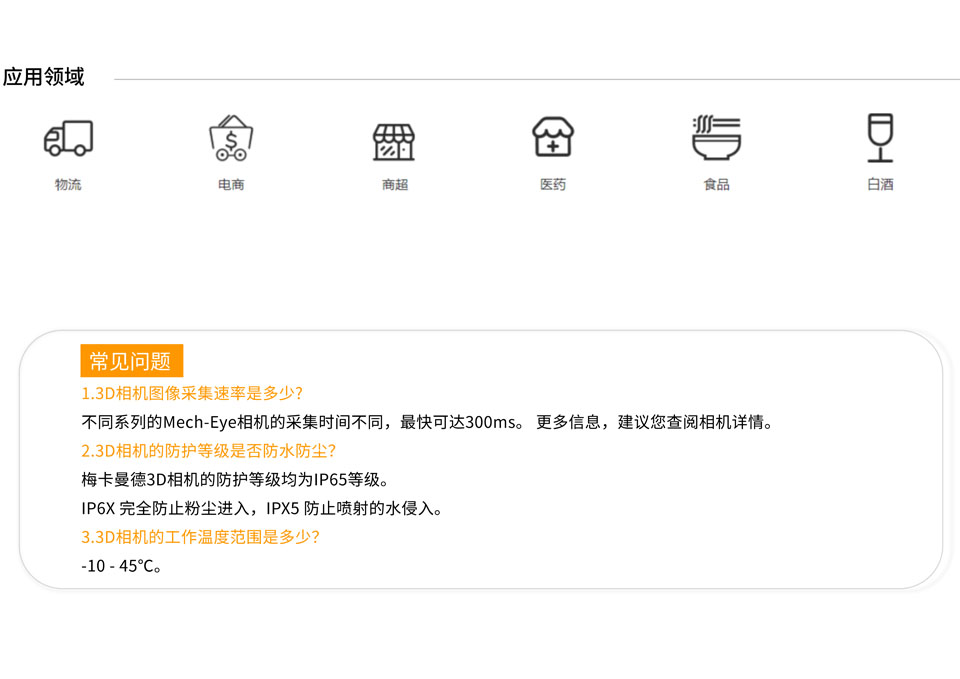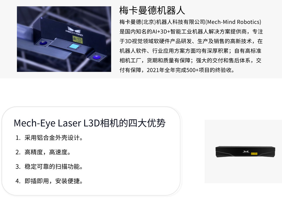 梅卡曼德Mech-Eye Laser工业级激光3D相机使用激光产生结构光,抗环境光性能优异,高精度,远端视场,更好满足大视野工况需求,扫描速度更快,广泛的应用场景。