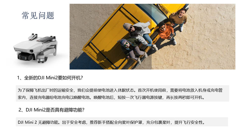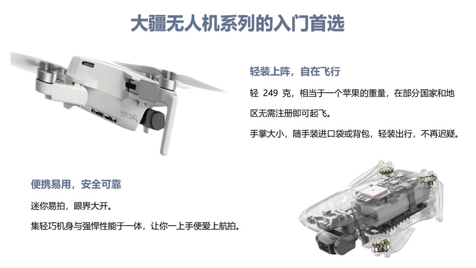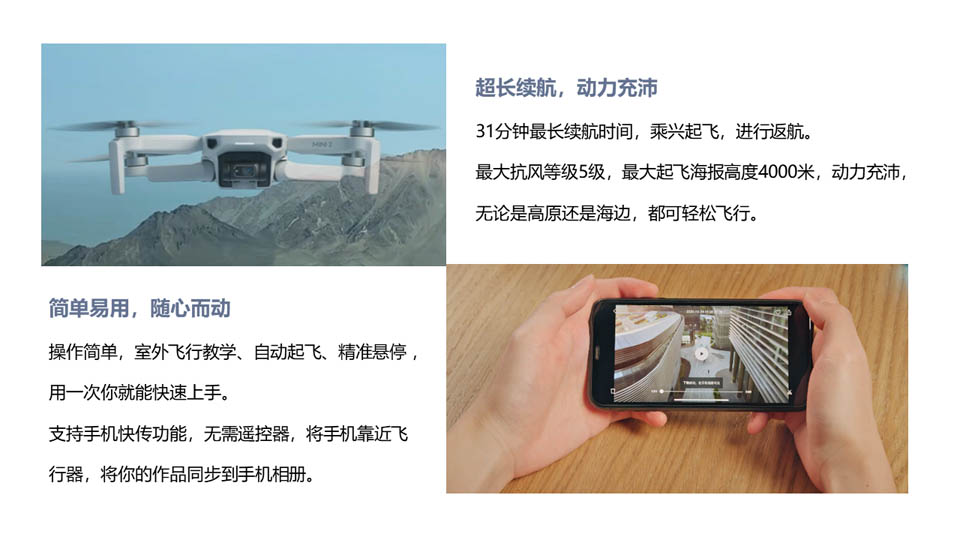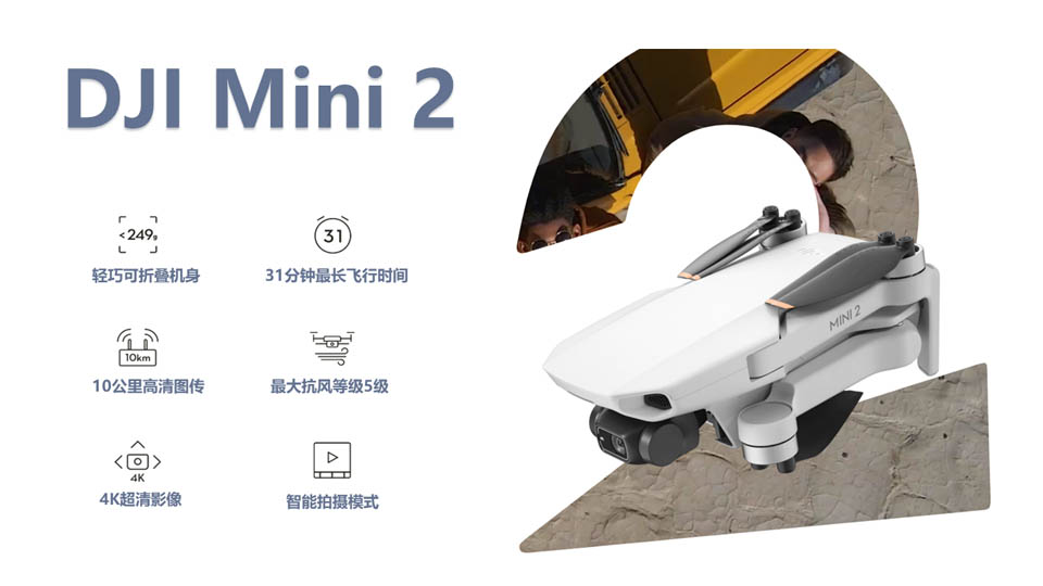 DJI Mini2作为大疆无人机系列的入门首选,轻便机身设计,便携易用,安全可靠,可拍摄4K视频,实现4倍变焦,最远图传控制距离可达10公里,支持一键短片、照片画质智能优化等功能。