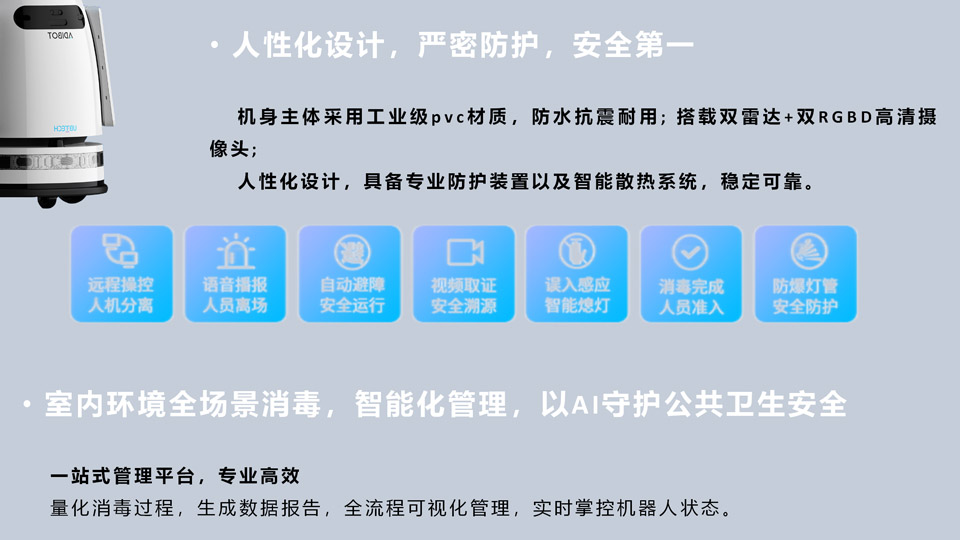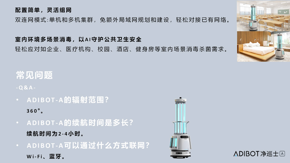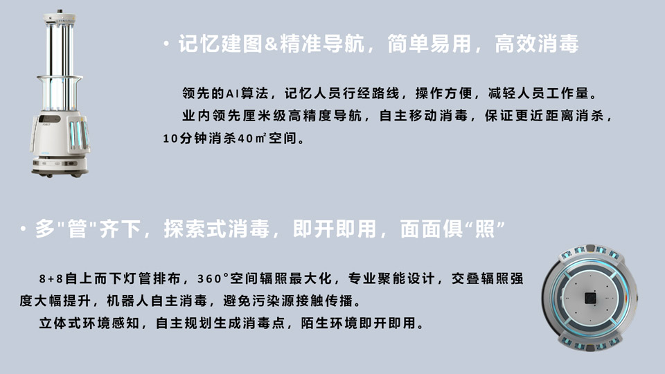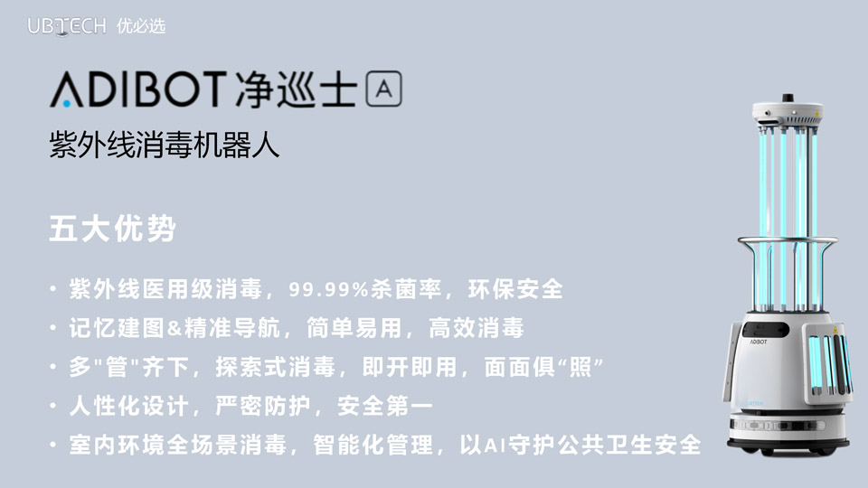 AI无畏,净无止境。优必选ADIBOT-A紫外线消毒机器人经过临床验证和测试的技术,UV-C(紫外线)用于空气和物体表面的消毒。环保消毒技术杜绝二次污染。采用紫外线最强杀菌波段253.7nm,通过破坏病原体的基因结构, 使其无法繁殖,失去传染性。强辐照 消杀可消灭99.99%以上有害的病原体,包括新冠病毒、非典病毒、真菌以及细菌等。