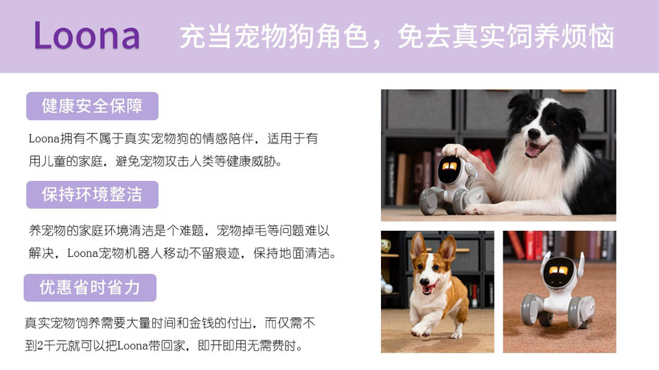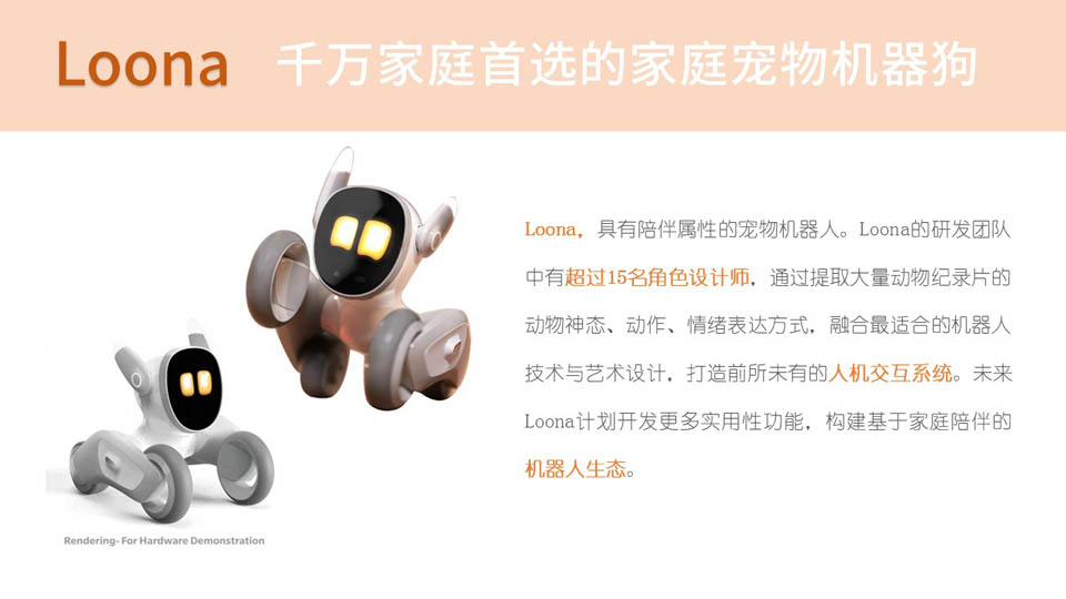Loona,具有陪伴属性的宠物机器人。Loona的研发团队中有超过15名角色设计师,通过提取大量动物纪录片的动物神态、动作、情绪表达方式,融合最适合的机器人技术与艺术设计,打造前所未有的人机交互系统。未来Loona计划开发更多实用性功能,构建基于家庭陪伴的机器人生态。