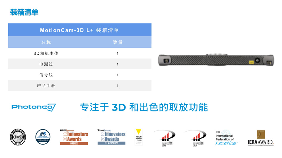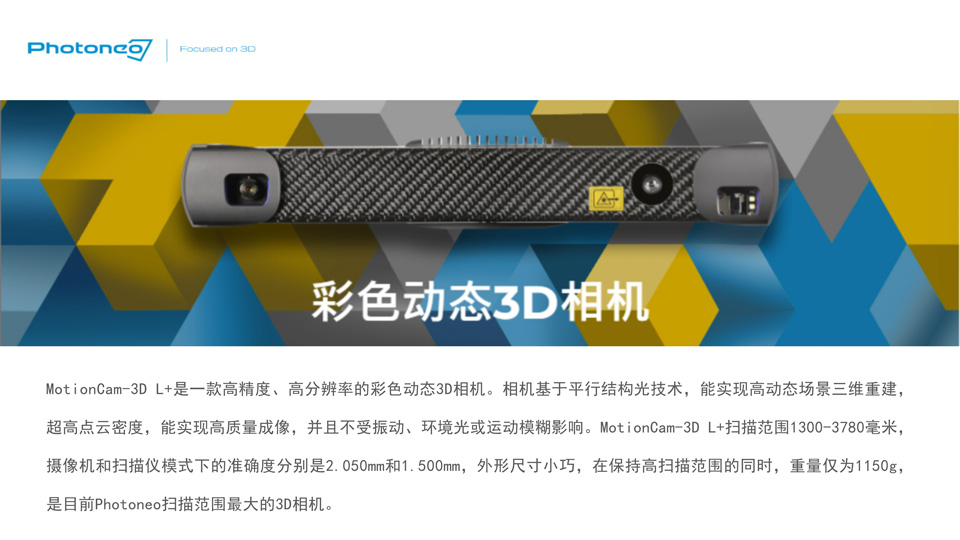 MotionCam-3D L+是一款高精度、高分辨率的彩色动态3D相机。相机基于平行结构光技术,能实现高动态场景三维重建,超高点云密度,能实现高质量成像,并且不受振动、环境光或运动模糊影响。MotionCam-3D L+扫描范围1300-3780毫米,摄像机和扫描仪模式下的准确度分别是2.050mm和1.500mm,外形尺寸小巧,在保持高扫描范围的同时,重量仅为1150g,是目前Photoneo扫描范围最大的3D相机。