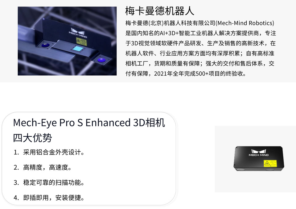 Mech-Eye Pro S Enhanced工业级3D相机可对众多物体高质量成像,性价比高,工业级设计,开放易用,更大视野,更大景深。