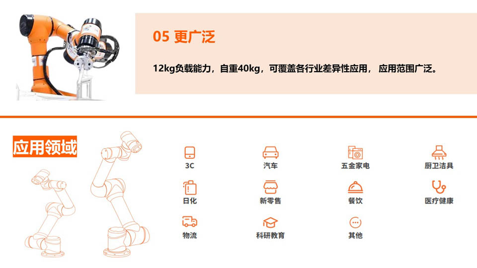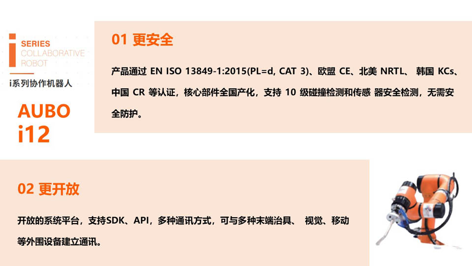 遨博i12协作机器人具有12KG负载能力,可覆盖各行业差异性应用,丰富的配置选择能够实现快速适配各种行业应用场景的需求,是提升生产效率、低成本运作的理想选择。i系列开放的系统平台,支持SDK、API,多种通讯方式,可与多种末端治具、 视觉、移动等外围设备建立通讯。