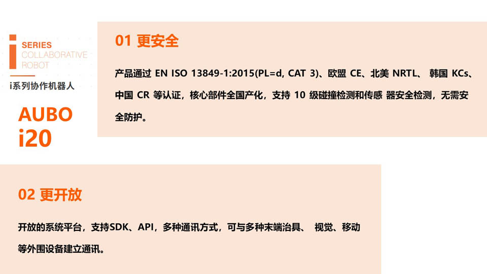 遨博i20协作机器人具有20KG负载能力,可覆盖各行业差异性应用,丰富的配置选择能够实现快速适配各种行业应用场景的需求,是提升生产效率、低成本运作的理想选择。i系列开放的系统平台,支持SDK、API,多种通讯方式,可与多种末端治具、 视觉、移动等外围设备建立通讯。