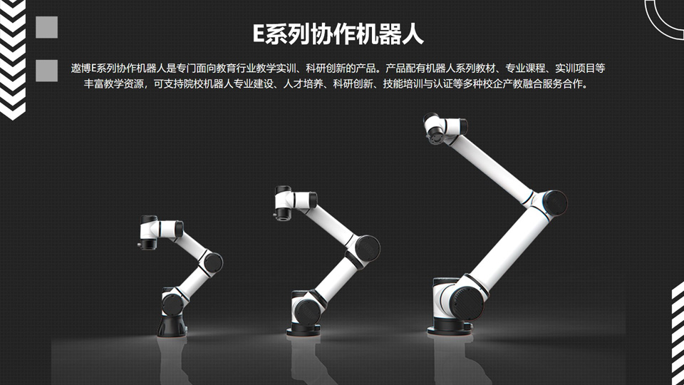 BFT机器人提供的遨博E系列协作机器人是面向教育业界的教育实训、科学研究革新的特化产品。AUBO-E5协作机器人可满足轻量化的作业需求 ,负载5kg,臂展1008mm,最大工作半径886.5mm,应用范围广泛,配置丰富.产品凭借安全稳定、简易编程等特点,覆盖中国欧洲、北美、东南亚等国家和地区。