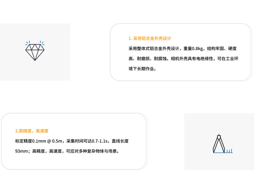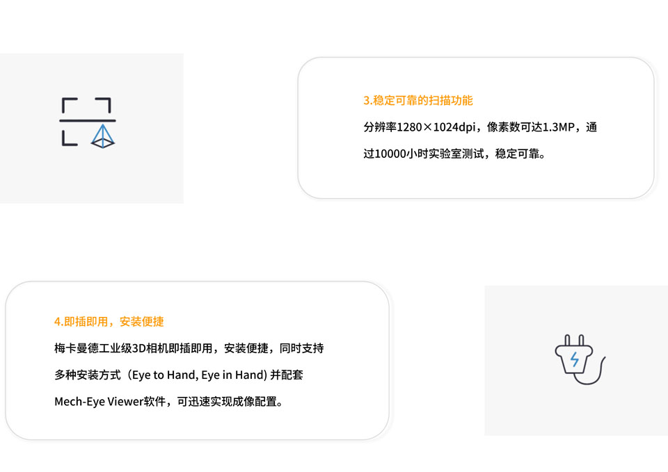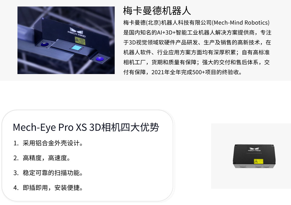 Mech-Eye Pro XS工业级3D相机体积小,精度高,可对复杂结构的物体产生完整、精细、准确的点云数据,适用于装配、拧螺丝、高精度抓取、检测等对精度要求较高的场景。