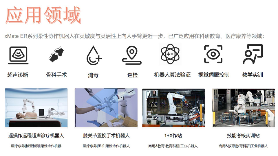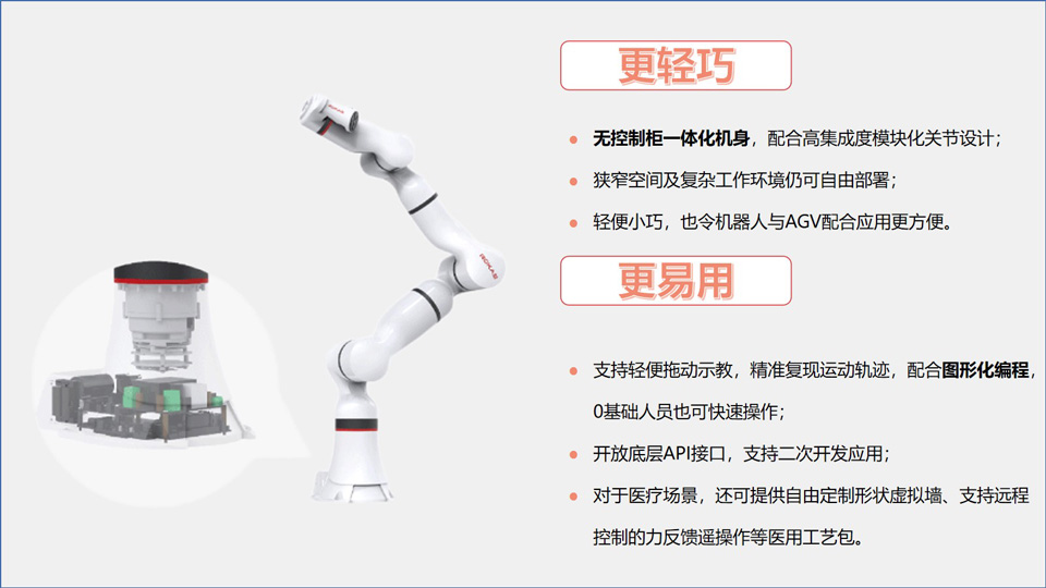 xMate ER系列基于完全自主知识产权研发,采用无控制柜一体化设计,各关节配置力矩传感器,具备国际领先的安全特性和接近人手臂的柔顺控制能力,与环境交互更加安全、智能。