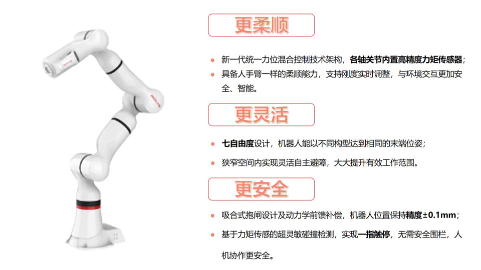 xMate ER系列基于完全自主知识产权研发,采用无控制柜一体化设计,各关节配置力矩传感器,具备国际领先的安全特性和接近人手臂的柔顺控制能力,与环境交互更加安全、智能。