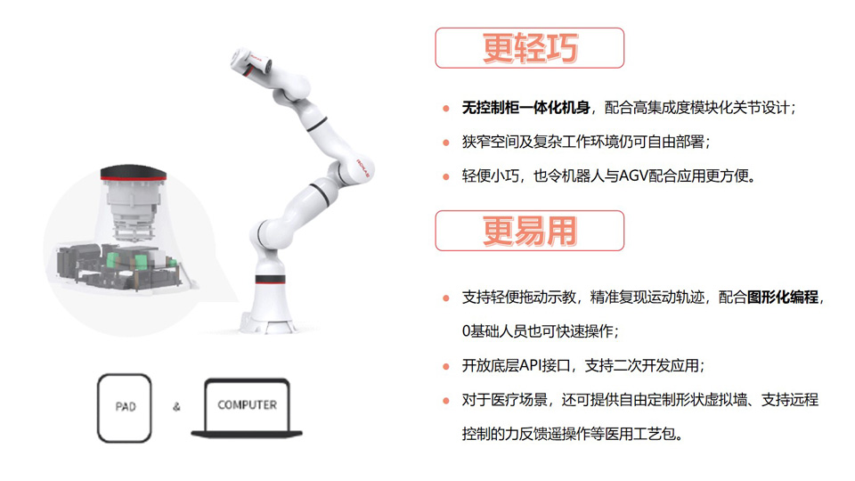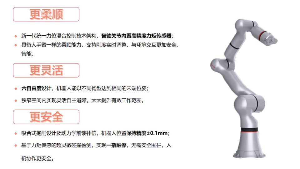xMate ER系列基于完全自主知识产权研发,采用无控制柜一体化设计,各关节配置力矩传感器,具备国际领先的安全特性和接近人手臂的柔顺控制能力,与环境交互更加安全、智能。