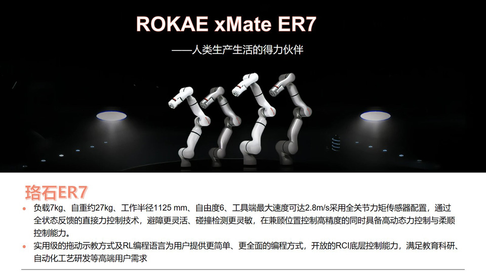 BFT机器人提供的珞石柔性协作机器人ROKAE xMate 系列珞石xMate ER7负载7kg、自重约27kg、工作半径1125 mm、自由度6、工具端最大速度可达2.8m/s采用全关节力矩传感器配置,通过全状态反馈的直接力控制技术,避障更灵活、碰撞检测更灵敏,在兼顾位置控制高精度的同时具备高动态力控制与柔顺控制能力。实用级的拖动示教方式及RL编程语言为用户提供更简单、更全面的编程方式。