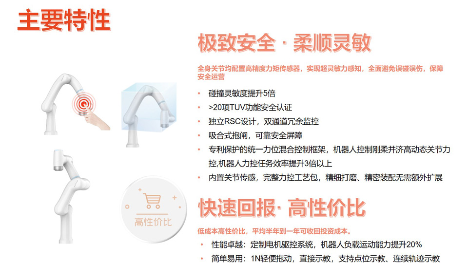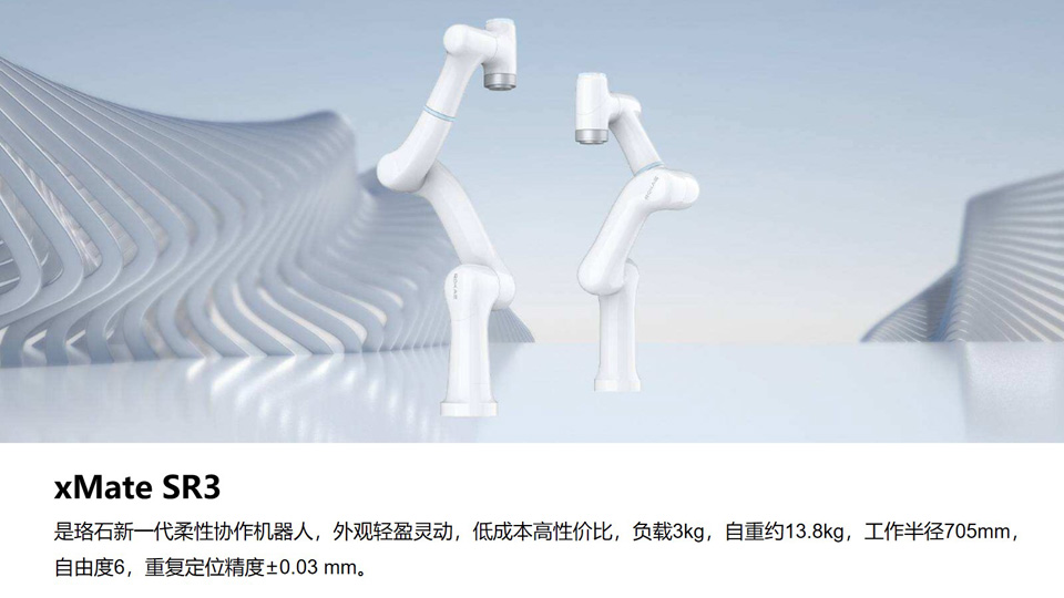 BFT机器人提供的珞石柔性协作机器人ROKAE xMate 系列珞石xMate SR3是珞石新一代柔性协作机器人,外观轻盈灵动,低成本高性价比,负载3kg,自重约13.8kg,工作半径705mm,自由度6,重复定位精度±0.03 mm。采用极致轻量化机身设计,配置多重安全防护技术具备超灵敏力感知,简单易用操作无门槛,最快半年可收回投资成本,是智能化场景升级改造中的理想之选。