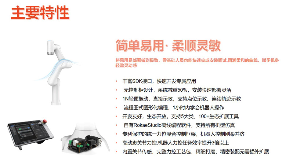 BFT机器人提供的珞石柔性协作机器人ROKAE xMate 系列珞石xMate SR4,外观轻盈灵动,低成本高性价比,负载4kg,自重约16.5kg,工作半径919mm,自由度6,重复定位精度±0.05mm。采用极致轻量化机身设计,配置多重安全防护技术具备超灵敏力感知,简单易用操作无门槛,最快半年可收回投资成本,是智能化场景升级改造中的理想之选。