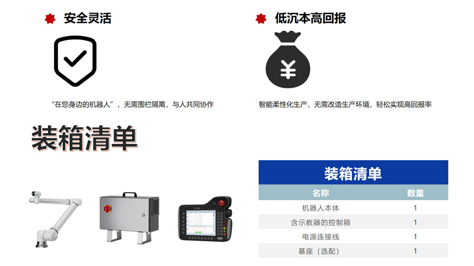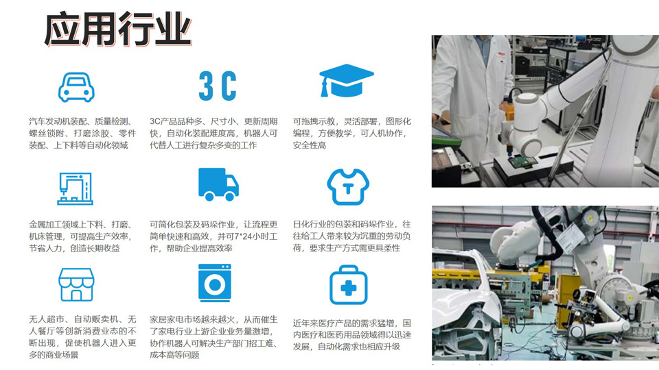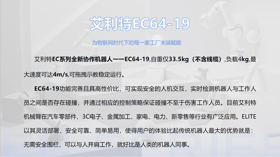 BFT机器人提供的艾利特协作机器人EC系列一一EC64-19,,自重仅33.5kg(不含线缆),负载4kg,最大速度可达4m/s,可拖拽示教稳定运行。EC64-19功能完善且高性价比,可实现安全的人机交互,实时检测机器人与工作人员之间是否存在碰撞,并通过相应的控制策略保证碰撞不至于伤害工作人员。目前机械臂在汽车零部件、3C电子、金属加工、家电、电力、新零售等行业有广泛应用。