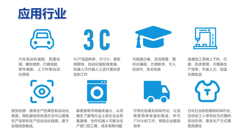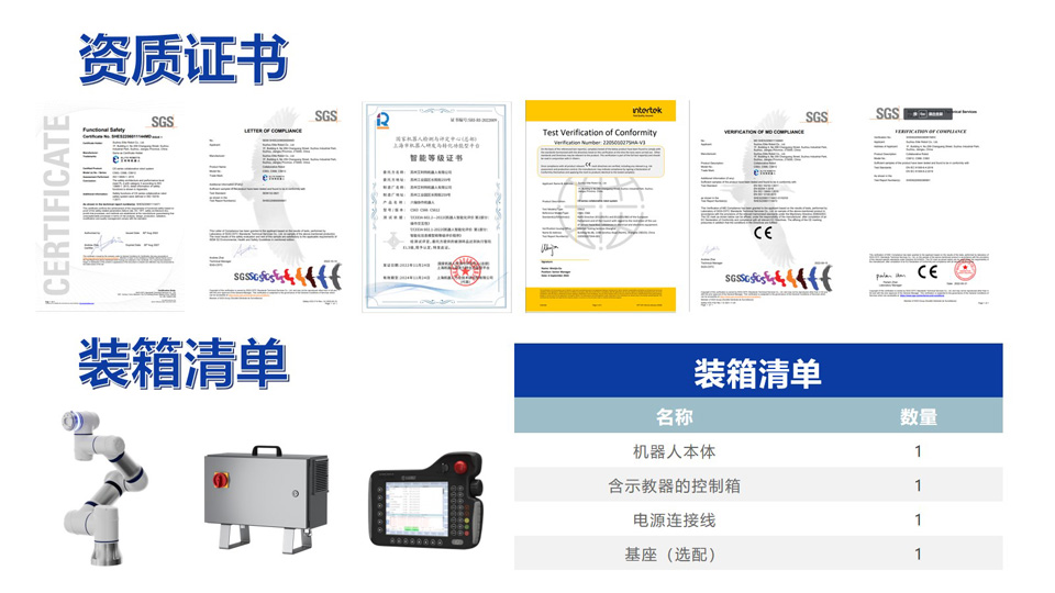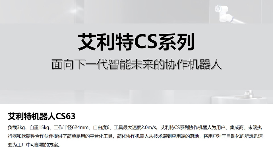 BFT机器人提供的艾利特协作机器人CS系列一一CS63,负载3kg、自重15kg、工作半径624mm、自由度6、工具最大速度2.0m/s。能为用户、集成商、末端执行器和软硬件合作伙伴提供了简单易用的平台化工具,简化协作机器人从技术端到应用端的落地,将用户对于自动化的所想迅速变为工厂中可部署的方案。
