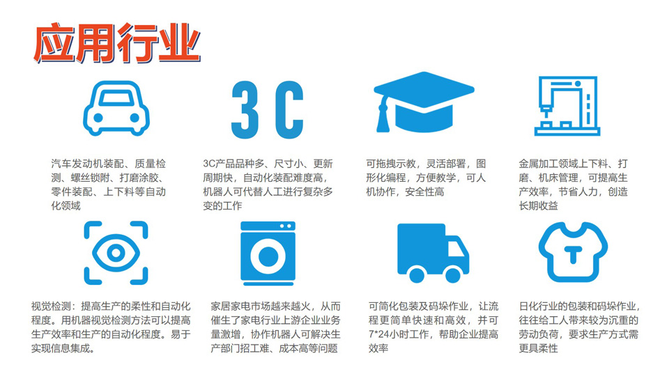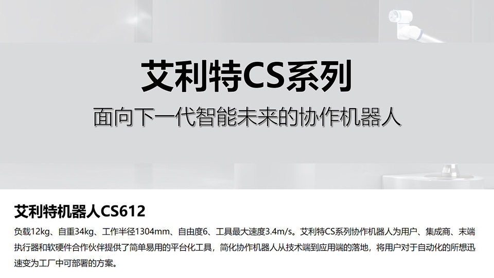 BFT机器人提供的艾利特协作机器人CS系列一一CS612,负载12kg、自重34kg、工作半径1304mm、自由度6、工具最大速度3.4m/s。能为用户、集成商、末端执行器和软硬件合作伙伴提供了简单易用的平台化工具,简化协作机器人从技术端到应用端的落地,将用户对于自动化的所想迅速变为工厂中可部署的方案。