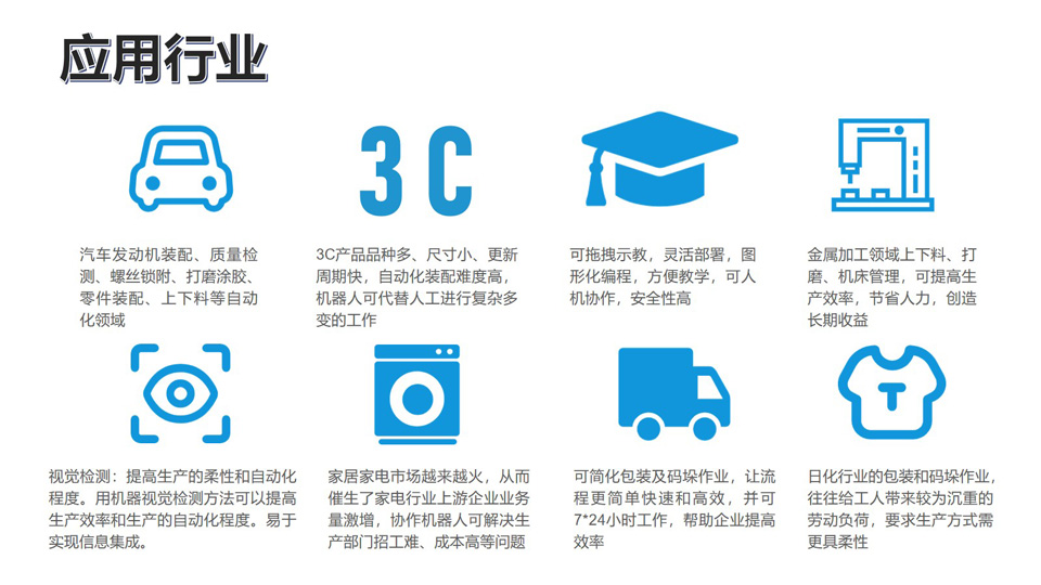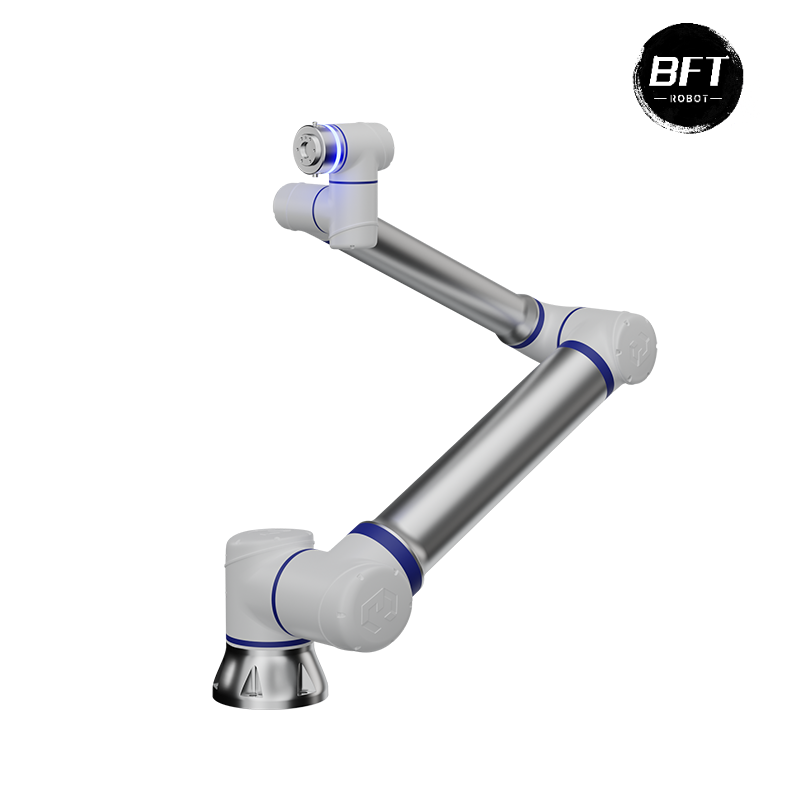 BFT机器人提供的艾利特协作机器人CS系列一一CS620,负载20kg、自重60kg、工作半径1800mm、自由度6、工具最大速度3.9m/s。能为用户、集成商、末端执行器和软硬件合作伙伴提供了简单易用的平台化工具,简化协作机器人从技术端到应用端的落地,将用户对于自动化的所想迅速变为工厂中可部署的方案。