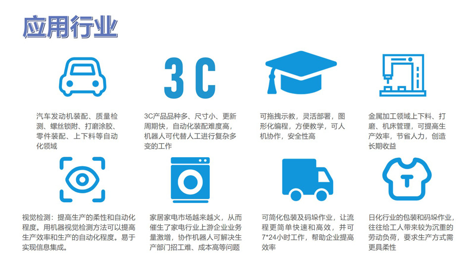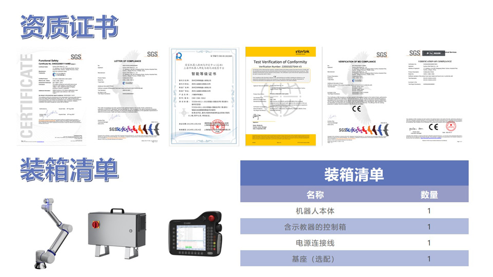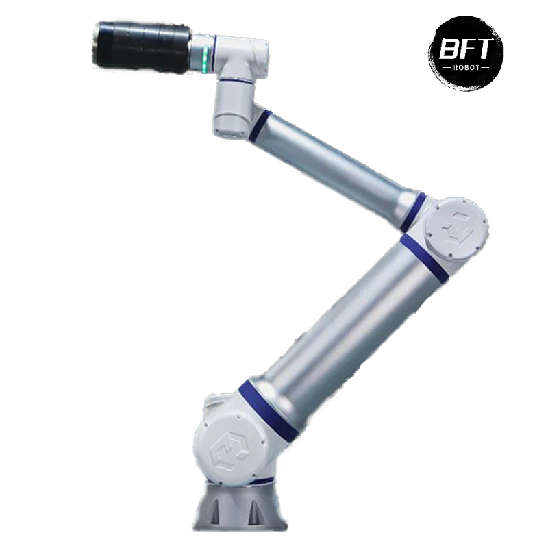 BFT机器人提供的艾利特协作机器人CS系列一一CS625,负载25kg、自重58kg、工作半径1500mm、自由度6、工具最大速度3.3m/s。能为用户、集成商、末端执行器和软硬件合作伙伴提供了简单易用的平台化工具,简化协作机器人从技术端到应用端的落地,将用户对于自动化的所想迅速变为工厂中可部署的方案。