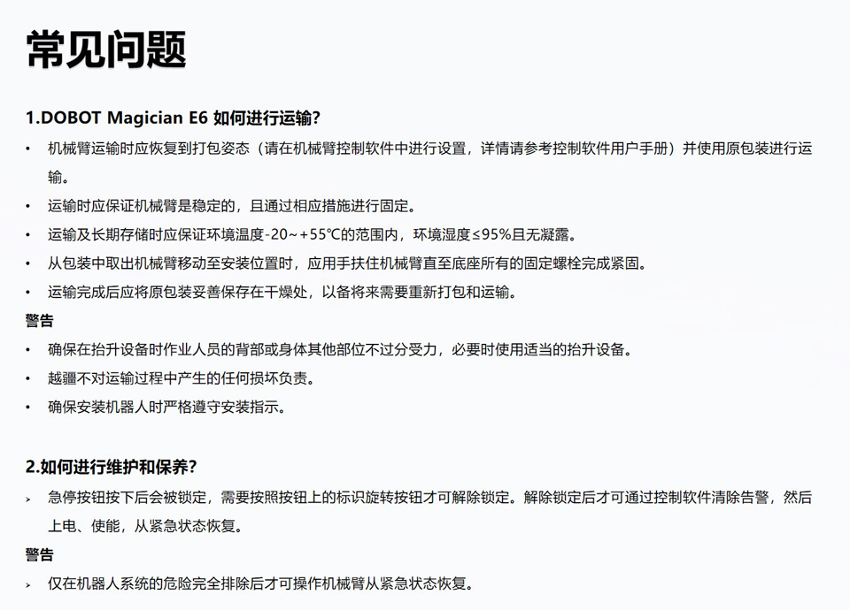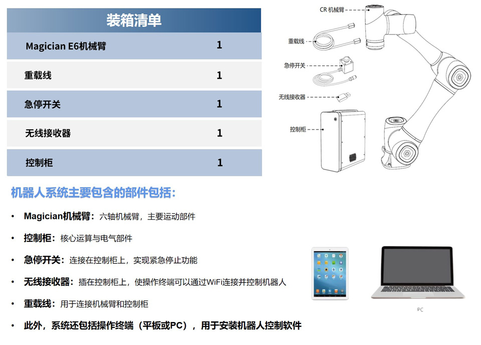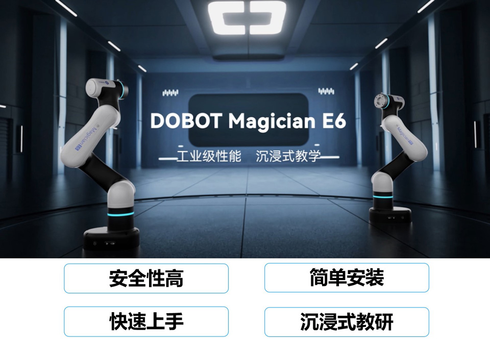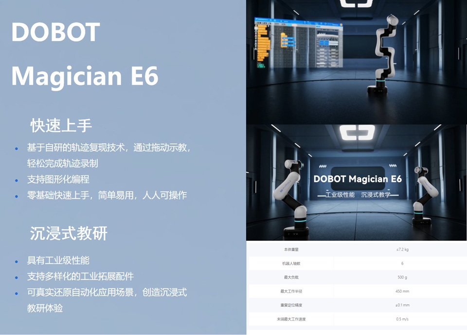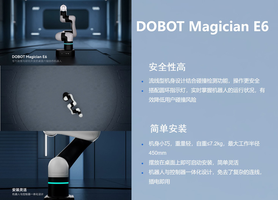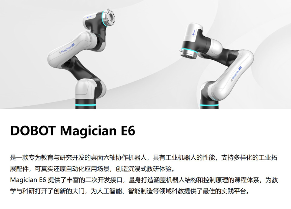 BFT机器人提供的DOBOT Magician E6 是一款专为教育与研究开发的桌面六轴协作机器人,具有工业机器人的性能,支持多样化的工业拓展配件,可真实还原自动化应用场景,创造沉浸式教研体验。Magician E6 提供了丰富的二次开发接口,量身打造涵盖机器人结构和控制原理的课程体系,为教学与科研打开了创新的大门,为人工智能、智能制造等领域科教提供了最佳的实践平台。