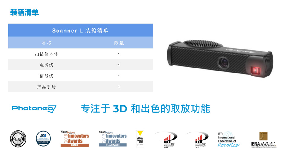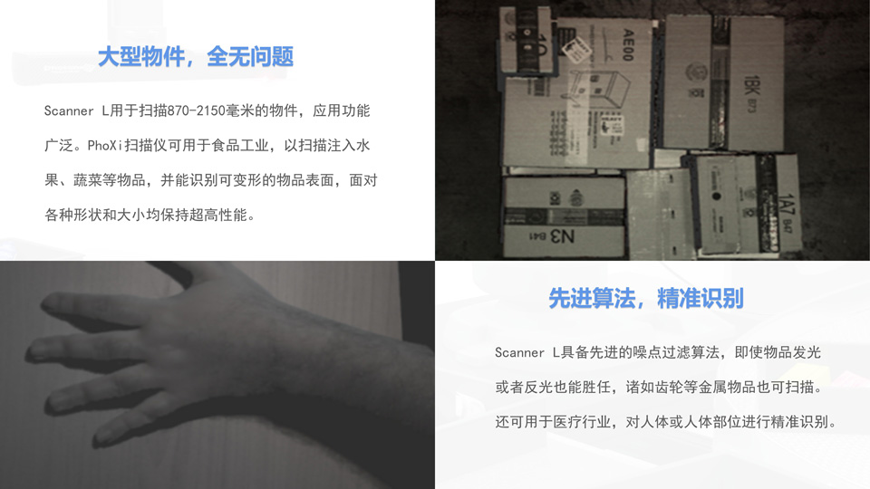 PHOTONEO PhoXi Scanner L的分辨率达到3.2m,扫描范围为870 – 2150 毫米,最佳扫描距离1239毫米,开放易用,更大视野,高精度,远端视场,更好满足大视野工况需求,扫描速度快。