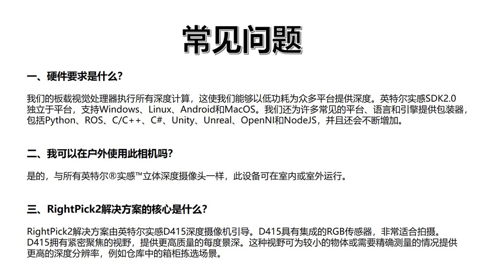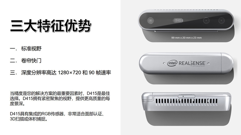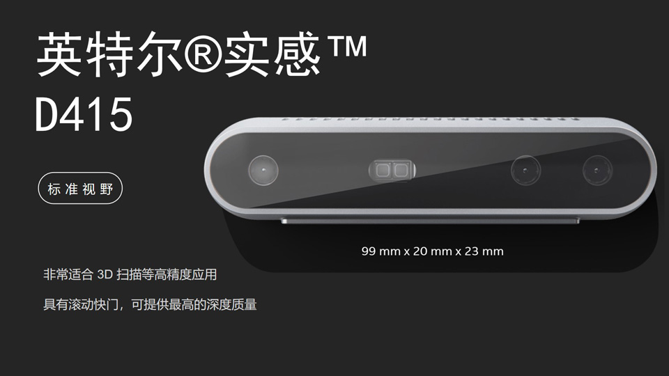 BFT机器人提供的英特尔实感D415具有标准视野,非常适合高精度应用,如3D扫描。通过深度传感器上的滚动快门,D415提供了我们每度最高的深度质量。