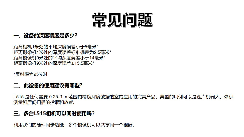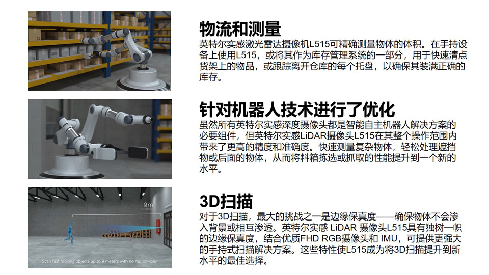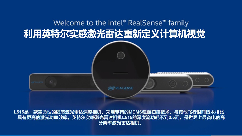 BFT机器人提供的intelL515是一款革命性的固态激光雷达深度相机,采用专有的MEMS镜面扫描技术,与其他飞行时间技术相比,具有更高的激光功率效率。英特尔实感激光雷达相机L515的深度流功耗不到3.5瓦,是世界上最省电的高分辨率激光雷达相机。