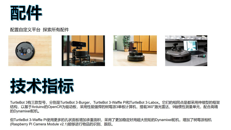 BFT机器人提供的Turtlebot3-Waffle Pi移动机器人Waffle Pi和Burger最大的不同在于驱动舵机和相机。Waffle Pi采用了更加稳定好用的树莓派3单板计算机(Raspberry Pi 3 Model B),并且使用配套的树莓派相机(Raspberry Pi Camera Module v2.1)能够进行物品的识别、跟踪。