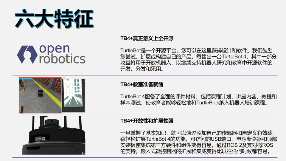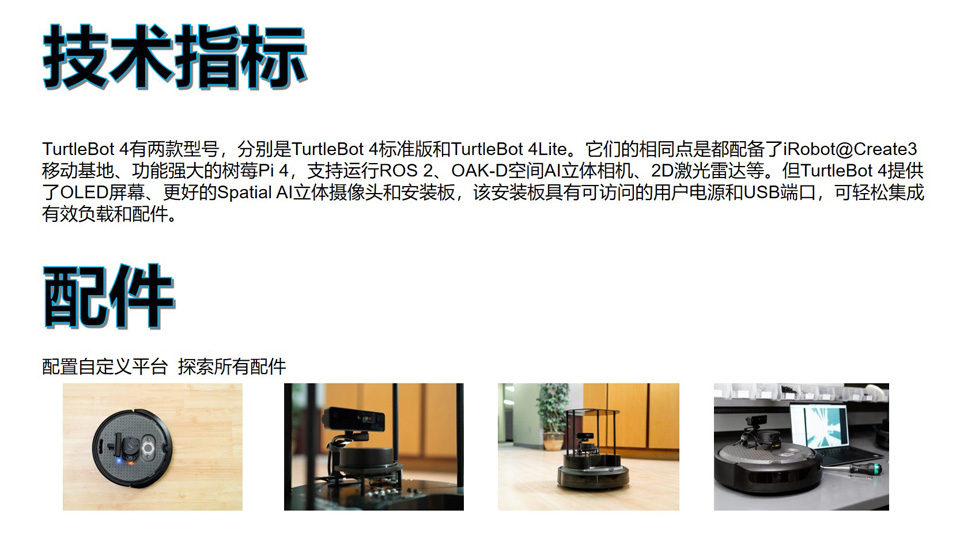 BFT机器人提供的Turtlebot4-Standard移动机器人配备了iRobot@Create3移动基地、功能强大的树莓Pi 4,支持运行ROS 2、OAK-D空间AI立体相机、2D激光雷达等。相对于TurtleBot 4 Lite版本,TurtleBot 4独具架高层,UI交互面板,AI立体相机Pro(增加内置IMU,红外光夜视及可见光测距),自带遥控手柄。