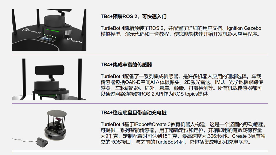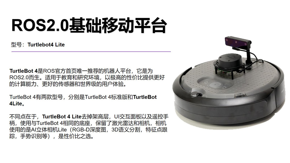 BFT平台提供的TurtleBot 4 Lite去掉架高层,UI交互面板以及遥控手柄,使用与TurtleBot 4相同的底座,保留了激光雷达和相机,相机使用的是AI立体相机Lite(RGB-D深度图,3D语义分割,特征点跟踪,手势识别等),是性价比之选。