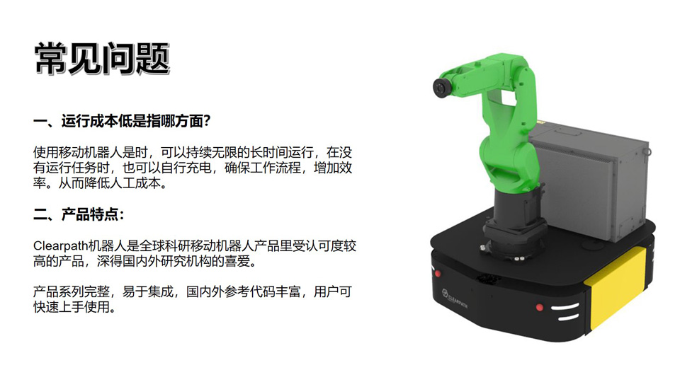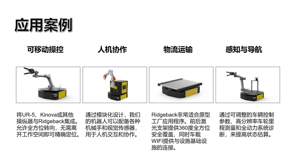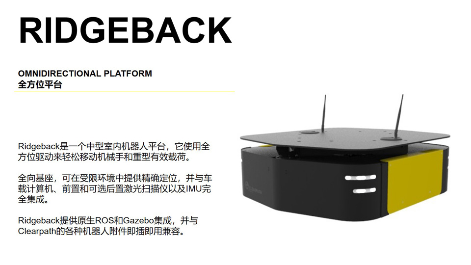 BFT机器人提供的Ridgeback是一个中型室内机器人平台,它使用全方位驱动来轻松移动机械手和重型有效载荷。全向基座,可在受限环境中提供精确定位,并与车载计算机、前置和可选后置激光扫描仪以及IMU完全集成。