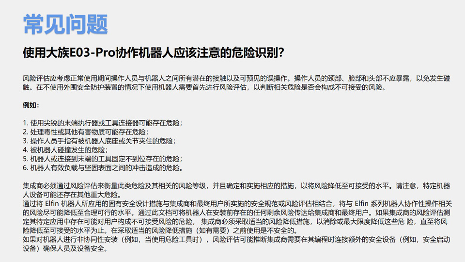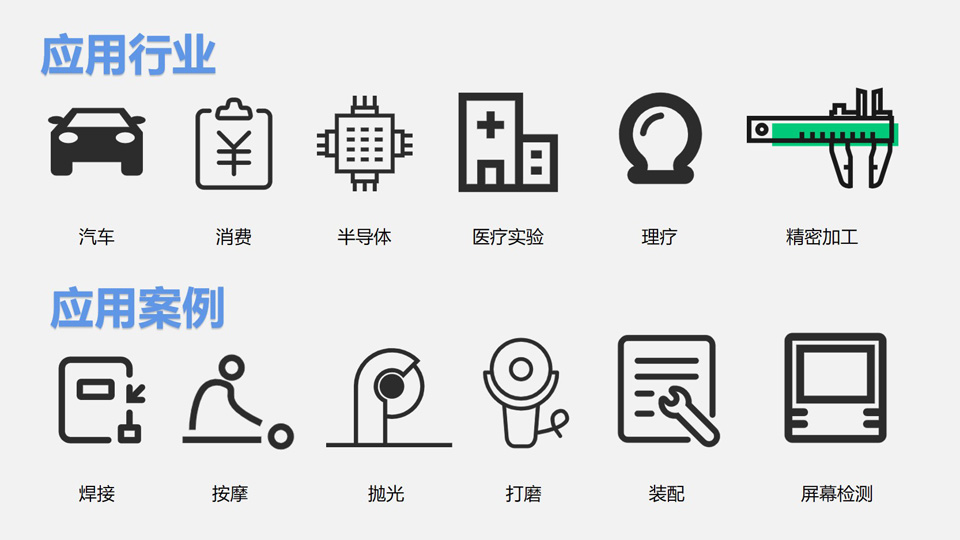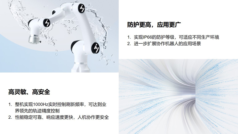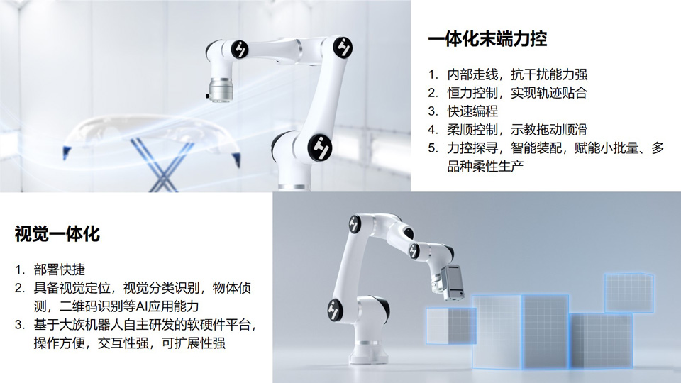 BFT机器人提供的大族E03Pro自重18kg、有效负载3kg、工作范围590mm、六自由度、重复精度可达±0.02mm。集成前沿AI技术,实现末端力控一体化、末端视觉一体化,采用新的表面处理工艺,兼具美观与实用,达到性能更稳定可靠、人机协作更安全、应用场景更广泛的特点。