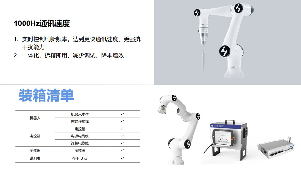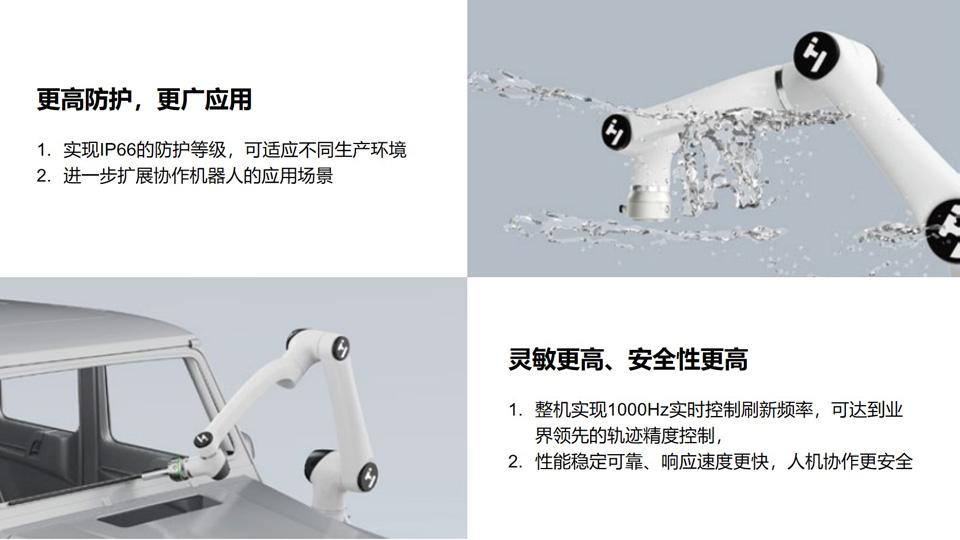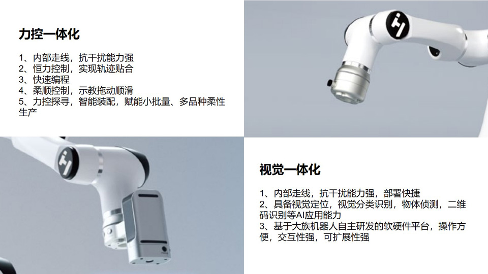 BFT机器人提供的E05-Pro自重25kg、有效负载5kg、工作范围800mm、六自由度、重复精度可达±0.02mm。集成前沿AI技术,实现末端力控一体化、末端视觉一体化,采用新的表面处理工艺,兼具美观与实用,达到性能更稳定可靠、人机协作更安全、应用场景更广泛的特点。