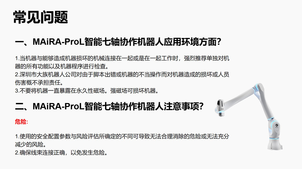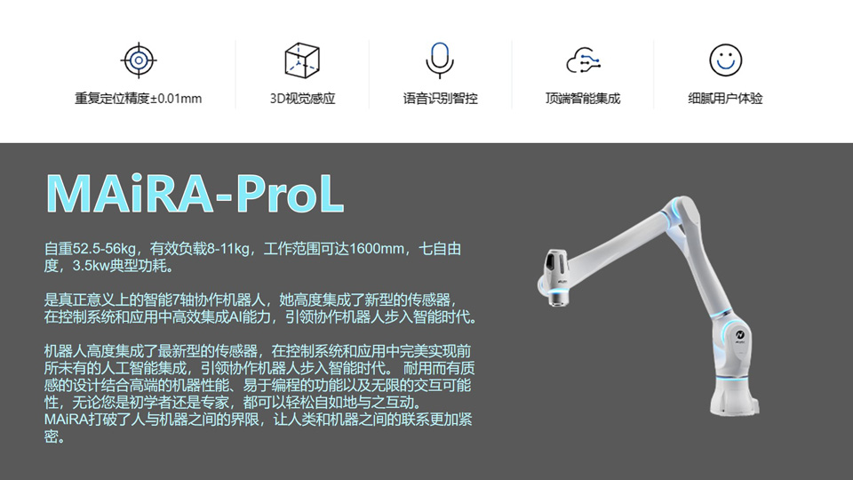 BFT机器人提供的大族MAiRA-ProL自重52.5-56kg,有效负载8-11kg,工作范围可达1600mm,七自由度,3.5kw典型功耗。 是真正意义上的智能7轴协作机器人,她高度集成了新型的传感器,在控制系统和应用中高效集成AI能力,引领协作机器人步入智能时代