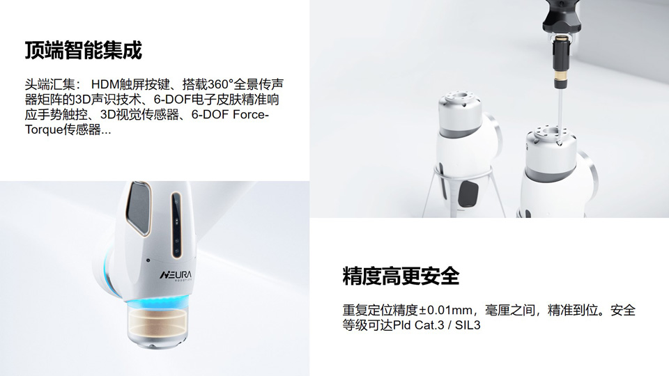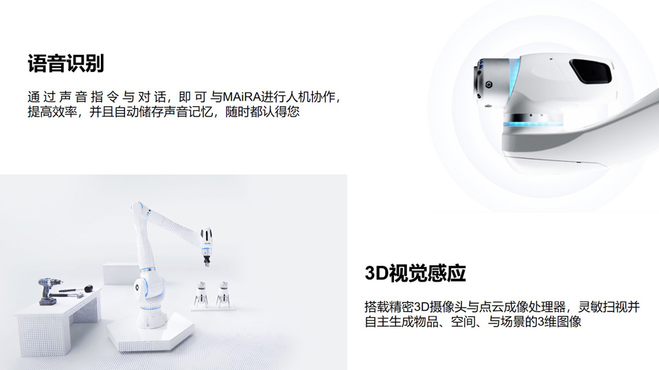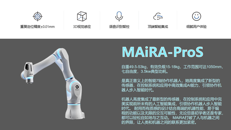 BFT机器人提供的大族MAiRA-ProS自重49.5-53kg,有效负载15-18kg,工作范围可达1050mm,七自由度,3.5kw典型功耗。是真正意义上的智能7轴协作机器人,她高度集成了新型的传感器,在控制系统和应用中高效集成AI能力,引领协作机器人步入智能时代。