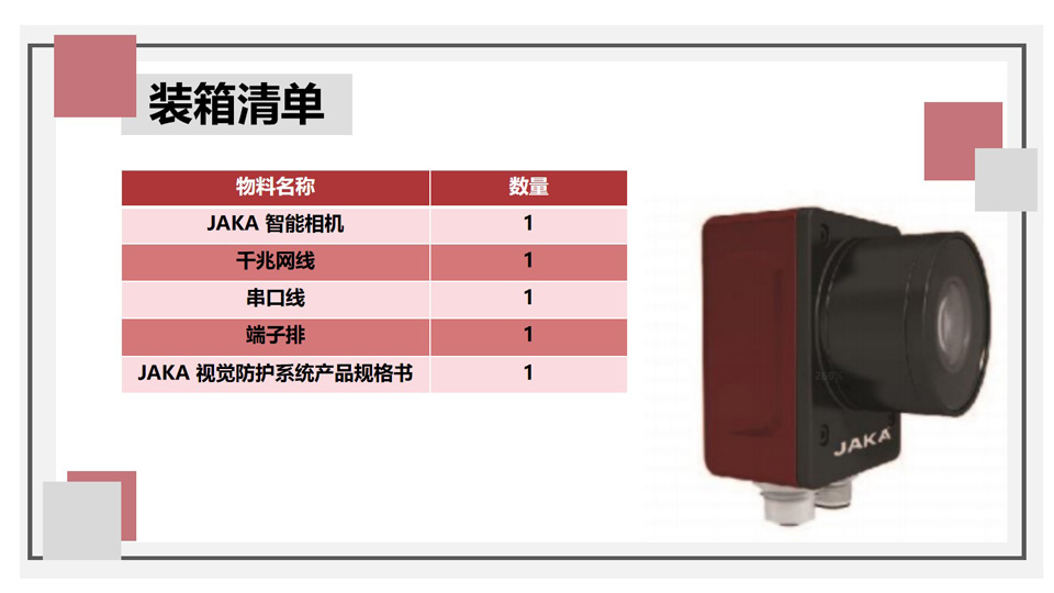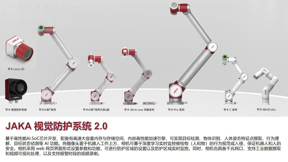 BFT机器人提供的JAKA视觉防护系统2.0基于高性能AI.SoC芯片开发,配备有高速大容量内存与存储空间,内嵌高性能加速引擎,可实现目标检测、物体识别、人体姿态特征点提取、行为理解、目标状态侦测等 AI 功能。将摄像头置于机器人工作上方,相机可基于深度学习实时监控被检物(人和物)的行为规范或入侵,保证机器人和人的安全。相机采用 web 网页界面形式设置参数和功能,可进行防护区域的设置以及防护区域实时监控。