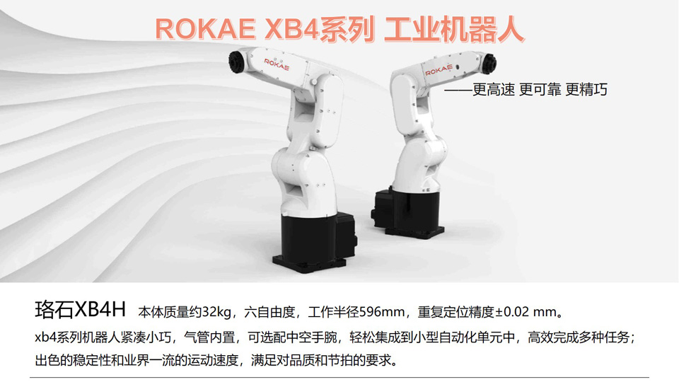 BFT机器人提供的珞石XB4H本体质量约32kg,六自由度,工作半径596mm,重复定位精度±0.02 mm。xb4系列机器人紧凑小巧,气管内置,可选配中空手腕,轻松集成到小型自动化单元中,高效完成多种任务; 出色的稳定性和业界一流的运动速度,满足对品质和节拍的要求。