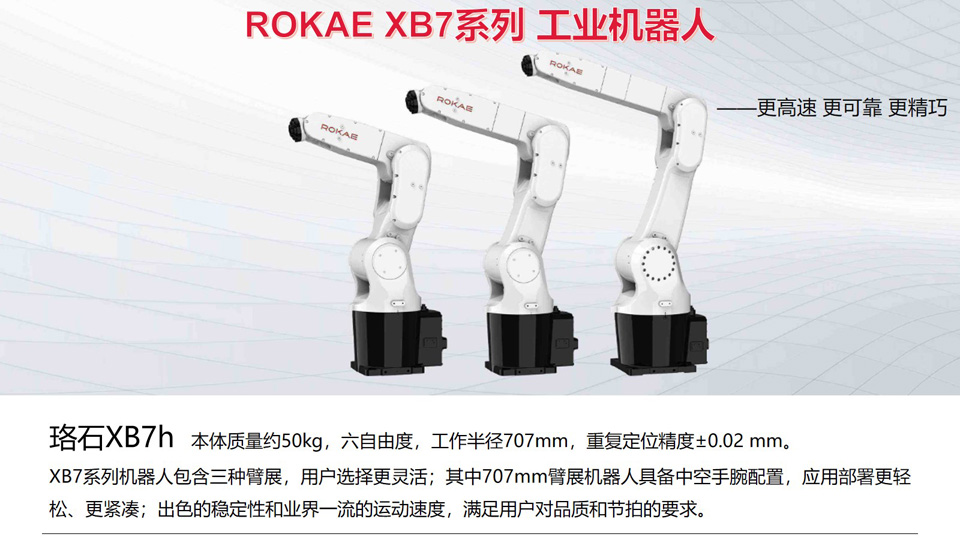 BFT机器人提供的珞石XB7h本体质量约50kg,六自由度,工作半径707mm,重复定位精度±0.02 mm。XB7系列机器人包含三种臂展,用户选择更灵活;其中707mm臂展机器人具备中空手腕配置,应用部署更轻松、更紧凑;出色的稳定性和业界一流的运动速度,满足用户对品质和节拍的要求。