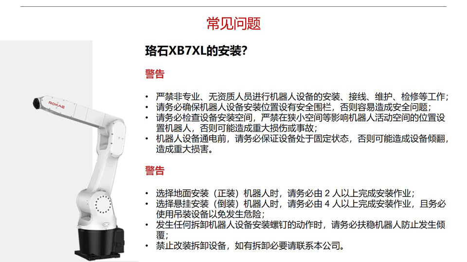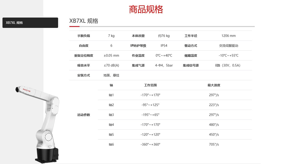 BFT机器人提供的珞石XB7XL本体质量约76kg,六自由度,工作半径1206mm,重复定位精度±0.05mm。XB7系列机器人包含三种臂展,用户选择更灵活;其中707mm臂展机器人具备中空手腕配置,应用部署更轻松、更紧凑;出色的稳定性和业界一流的运动速度,满足用户对品质和节拍的要求。