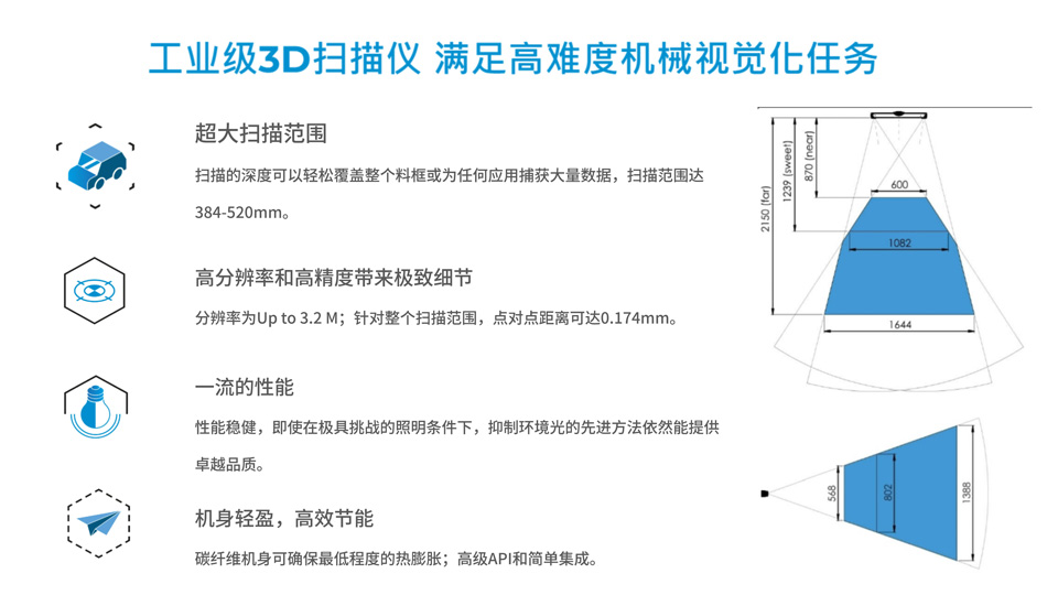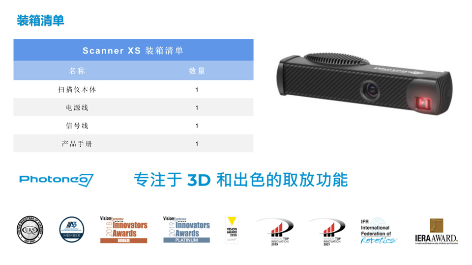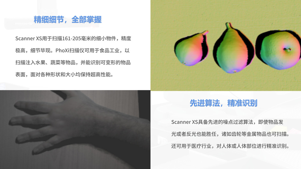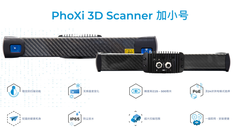 Phoxi 3D扫描仪是对静物进行高分辨率和高精度扫描的必备之选,其光投射技术产生的高精度点云可对物体快速定位,在恶劣环境中也能工作。Scanner XS 专为精确输出而设计,扫描范围161-205,mm,点对点距离0.055mm,校准精度0.035mm,碳纤维机身,运用结构光原理,红色激光扫描,点云规模最高可达3.2M,所见即所得,可应用于印刷电路板、精细零部件检测等。