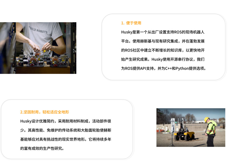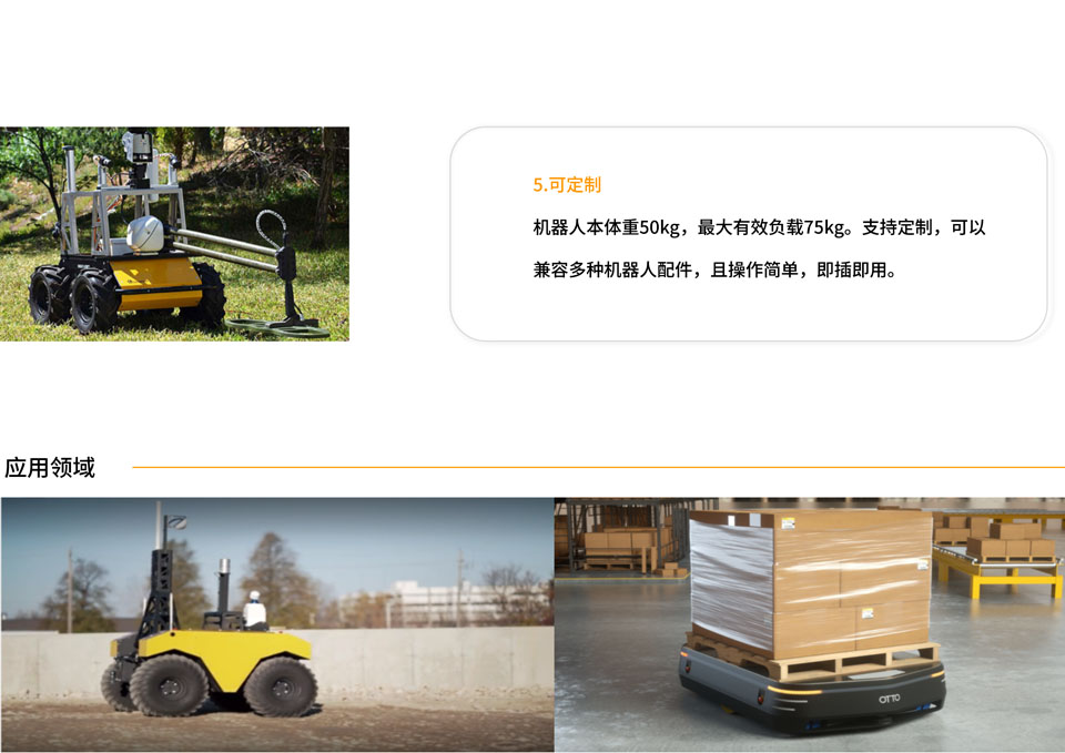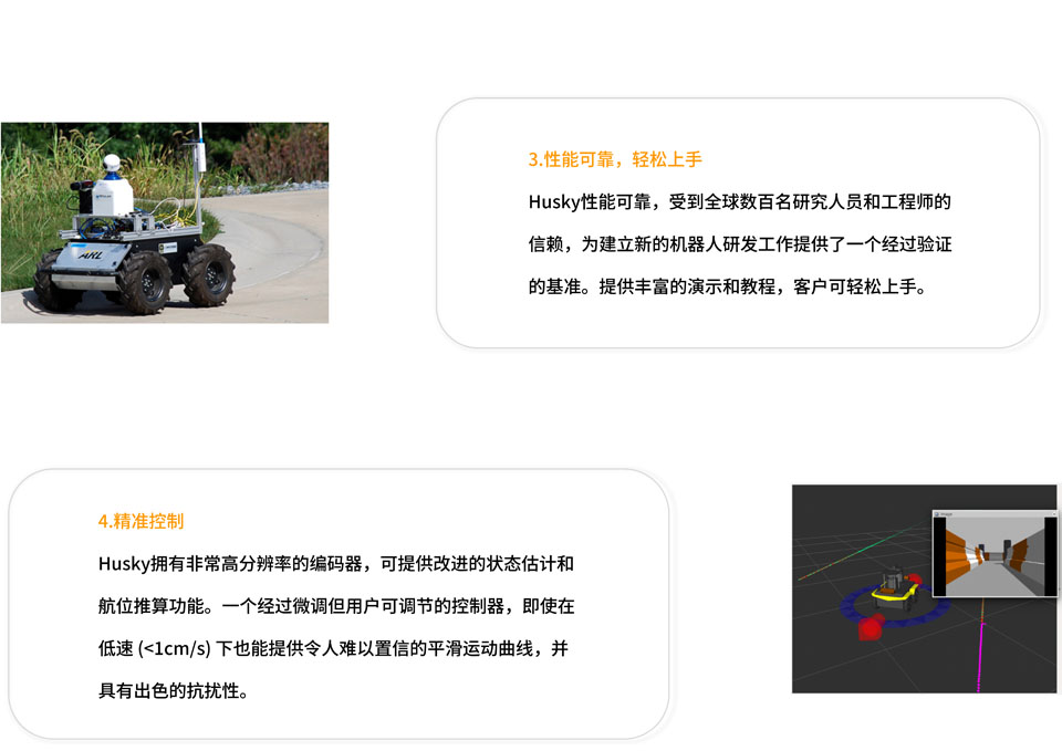 HUSKY A200移动小车的最高可负载75KG。移动平台采用高扭矩的4轮独立驱动及13英寸宽距轮胎,保证该移动平台具有良好的越野性能及可以实现零度差分转向。