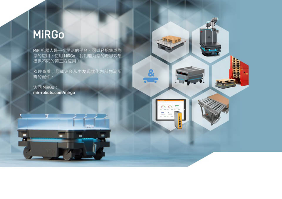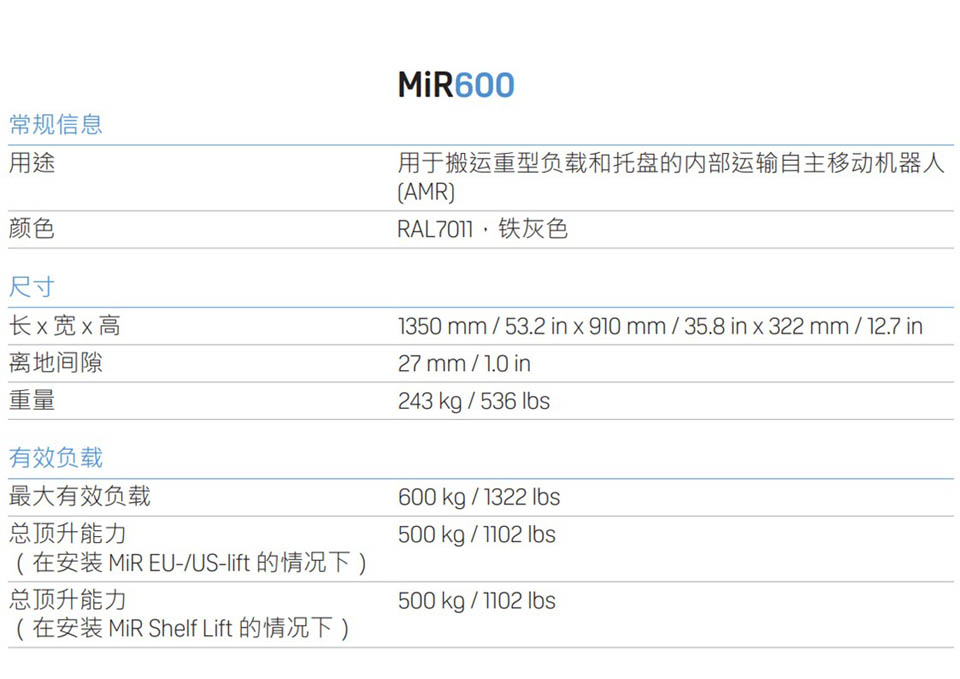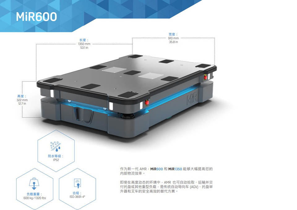 MiR600自主移动机器人的有效负载为600kg,满载时的电池运行时间可达8小时以上,可以可以在 MiR600上轻松布设顶部模块,我们为您提供了多款可实现快速集成及扩展的开箱即用式解决方案。